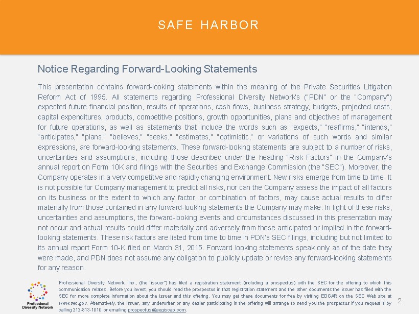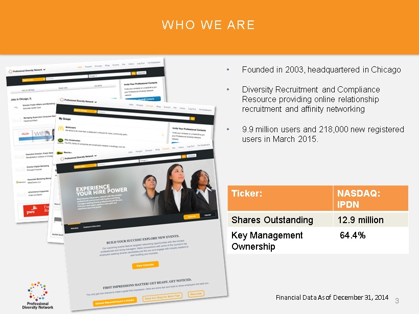 SAFE HARBOR Notice Regarding Forward - Looking Statements This presentation contains forward - looking statements within the meaning of the Private Securities Litigation Reform Act of 1995 . All statements regarding Professional Diversity Network’s (“PDN” or the “Company”) expected future financial position, results of operations, cash flows, business strategy, budgets, projected costs, capital expenditures, products, competitive positions, growth opportunities, plans and objectives of management for future operations, as well as statements that include the words such as “expects,” “ reaffirms,” “intends,” “anticipates,” “plans,” “believes,” “seeks,” “estimates,” “optimistic,” or variations of such words and similar expressions, are forward - looking statements . These forward - looking statements are subject to a number of risks, uncertainties and assumptions, including those described under the heading “Risk Factors” in the Company’s annual report on Form 10 K and filings with the Securities and Exchange Commission (the “SEC”) . Moreover, the Company operates in a very competitive and rapidly changing environment . New risks emerge from time to time . It is not possible for Company management to predict all risks, nor can the Company assess the impact of all factors on its business or the extent to which any factor, or combination of factors, may cause actual results to differ materially from those contained in any forward - looking statements the Company may make . In light of these risks, uncertainties and assumptions, the forward - looking events and circumstances discussed in this presentation may not occur and actual results could differ materially and adversely from those anticipated or implied in the forward - looking statements . These risk factors are listed from time to time in PDN’s SEC filings, including but not limited to its annual report Form 10 - K filed on March 31 , 2015 . Forward looking statements speak only as of the date they were made, and PDN does not assume any obligation to publicly update or revise any forward - looking statements for any reason . Professional Diversity Network, Inc . , (the “issuer”) has filed a registration statement (including a prospectus) with the SEC for the offering to which this communication relates . Before you invest, you should read the prospectus in that registration statement and the other documents the issuer has filed with the SEC for more complete information about the issuer and this offering . You may get these documents for free by visiting EDGAR on the SEC Web site at www . sec . gov . Alternatively, the issuer, any underwriter or any dealer participating in the offering will arrange to send you the prospectus if you request it by calling 212 - 813 - 1010 or emailing prospectus@aegiscap . com . 2