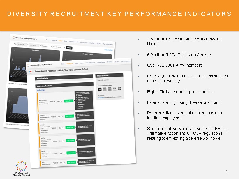 • Founded in 2003, headquartered in Chicago • Diversity Recruitment and Compliance Resource providing online relationship recruitment and affinity networking • 9.9 million users and 218,000 new registered users in March 2015. WHO WE ARE Financial Data As of December 31, 2014 3 Ticker: NASDAQ: IPDN Shares Outstanding 12.9 million Key Management Ownership 64.4%