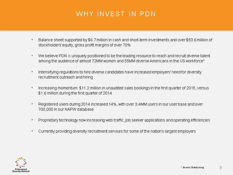 WHY INVEST IN PDN • B alance sheet supported by $6.7 million in cash and short - term investments and over $53.6 million of stockholders’ equity, gross profit margins of over 70% • We believe PDN is uniquely positioned to be the leading resource to reach and recruit diverse talent among the audience of almost 72MM women and 55MM diverse Americans in the US workforce* • Intensifying regulations to hire diverse candidates have increased employers’ need for diversity recruitment outreach and hiring • Increasing momentum: $11.2 million in unaudited sales bookings in the first quarter of 2015, versus $1.6 million during the first quarter of 2014 • Registered users during 2014 increased 14%, with over 3.4MM users in our user base and over 700,000 in our NAPW database • Proprietary technology now increasing web traffic, job seeker applications and operating efficiencies • Currently providing diversity recruitment services for some of the nation’s largest employers 5 * Source : Catalyst.org