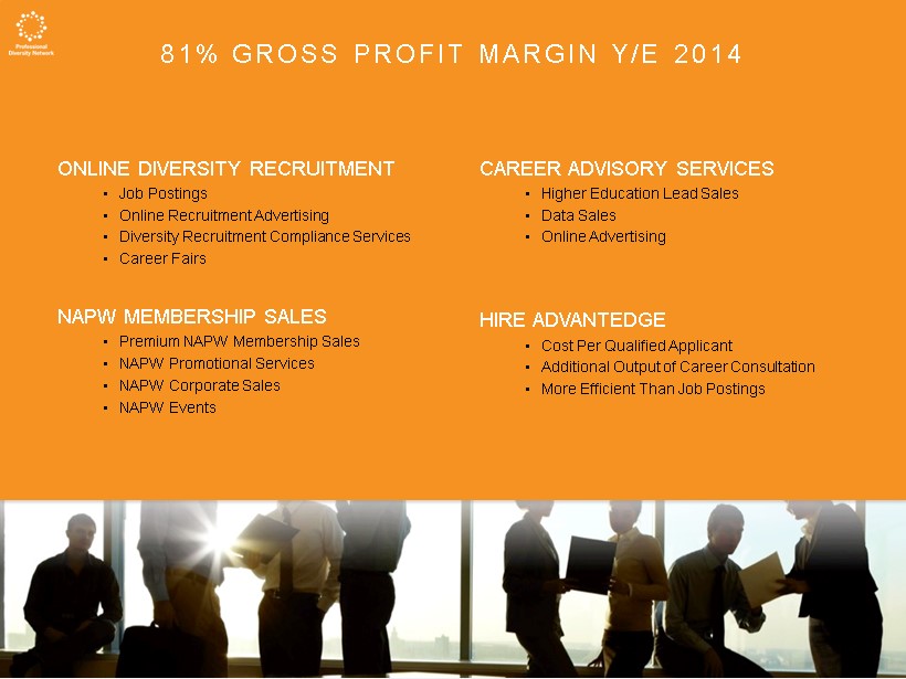 81% GROSS PROFIT MARGIN Y/E 2014 ONLINE DIVERSITY RECRUITMENT • Job Postings • Online Recruitment Advertising • Diversity Recruitment Compliance Services • Career Fairs NAPW MEMBERSHIP SALES • Premium NAPW Membership Sales • NAPW Promotional Services • NAPW Corporate Sales • NAPW Events CAREER ADVISORY SERVICES • Higher Education Lead Sales • Data Sales • Online Advertising HIRE ADVANTEDGE • Cost Per Qualified Applicant • Additional Output of Career Consultation • More Efficient Than Job Postings