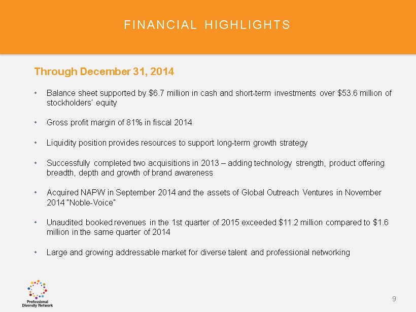 GROWING DIVERSIFIED REVENUE COMPONENTS OF PROFESSIONAL NETWORKING • Digital Diversity Recruitment to Leading Fortune 1,000 Employers o Our direct sales force bookings increased by 400% in 2014, with over 70% Gross Profit Margins • Premium Memberships for National Association of Professional Women o Over 60,000 members receive enhanced benefits for annual membership fee • Education Referrals to Diverse Job Seekers o Career counseling services to over 1 million job seekers annually, resulting in revenue from career and education referrals • Diversity Career Networking Events o Producing 30 professional networking events held throughout the country, hosted and managed by our recently acquired events division • Sales of Recruitment Services for Diverse Professional Organizations o PDN operates job boards and distributes job postings and recruitment advertising for numerous diverse professional organizations and websites 8