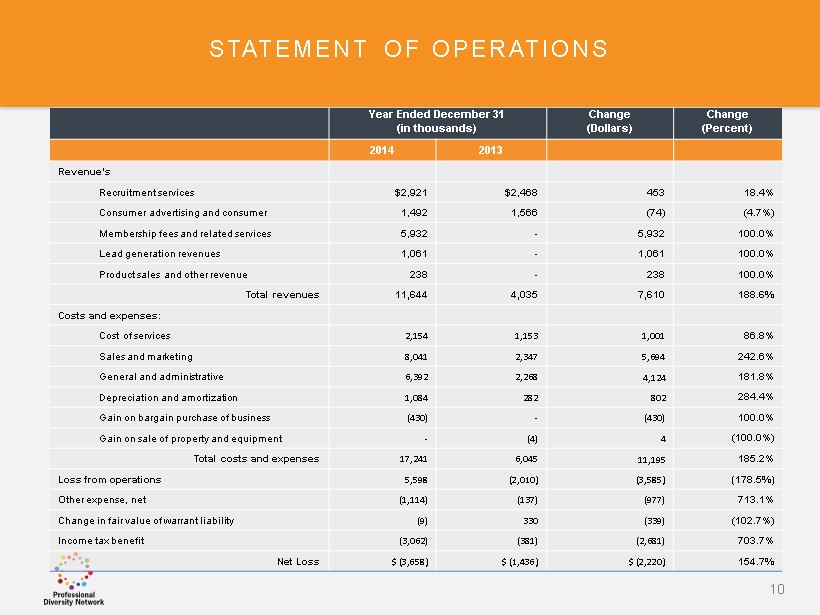 STATEMENT OF OPERATIONS 10 Year Ended December 31 (in thousands) Change (Dollars) Change (Percent) 2014 2013 Revenue’s Recruitment services $2,921 $2,468 453 18.4% Consumer advertising and consumer 1,492 1,566 (74) (4.7%) Membership fees and related services 5,932 - 5,932 100.0% Lead generation revenues 1,061 - 1,061 100.0% Product sales and other revenue 238 - 238 100.0% Total revenues 11,644 4,035 7,610 188.6% Costs and expenses: Cost of services 2,154 1,153 1,001 86.8% Sales and marketing 8,041 2,347 5,694 242.6% General and administrative 6,392 2,268 4,124 181.8% Depreciation and amortization 1,084 282 802 284.4% Gain on bargain purchase of business (430) - (430) 100.0% Gain on sale of property and equipment - (4) 4 (100.0%) Total costs and expenses 17,241 6,045 11,195 185.2% Loss from operations 5,598 (2,010) (3,585) (178.5%) Other expense, net (1,114) (137) (977) 713.1% Change in fair value of warrant liability (9) 330 (339) (102.7%) Income tax benefit (3,062) (381) (2,681) 703.7% Net Loss $ (3,658) $ (1,436) $ (2,220) 154.7%