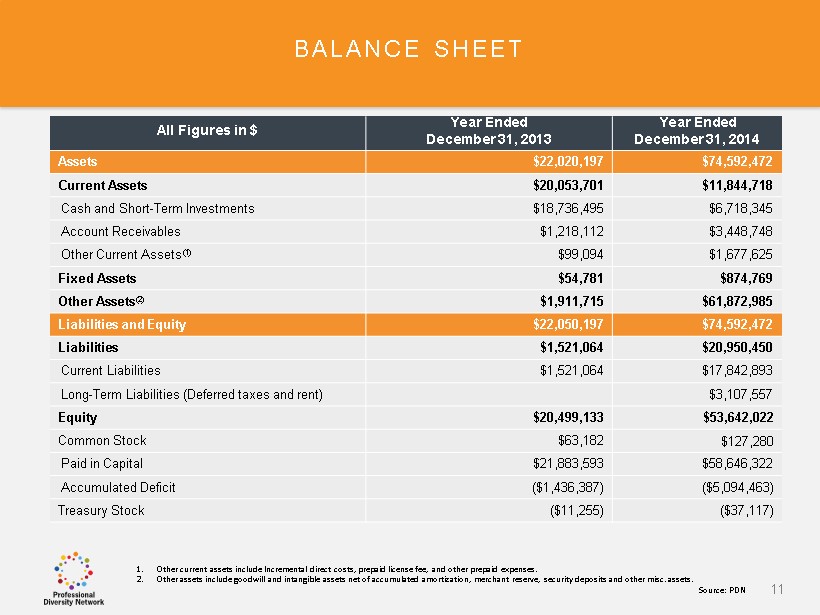 BALANCE SHEET 11 1. Other current assets include Incremental direct c osts , prepaid l icense f ee , and other prepaid expenses. 2. Other assets include goodwill and intangible assets net of accumulated amortization, merchant r eserve , security d eposits and other misc. assets. Source: PDN All Figures in $ Year Ended December 31, 2013 Year Ended December 31, 2014 Assets $22,020,197 $74,592,472 Current Assets $20,053,701 $11,844,718 Cash and Short - Term Investments $18,736,495 $6,718,345 Account Receivables $1,218,112 $3,448,748 Other Current Assets (1) $99,094 $1,677,625 Fixed Assets $54,781 $874,769 Other Assets (2) $1,911,715 $61,872,985 Liabilities and Equity $22,050,197 $74,592,472 Liabilities $1,521,064 $20,950,450 Current Liabilities $1,521,064 $17,842,893 Long - Term Liabilities (Deferred taxes and rent) $3,107,557 Equity $20,499,133 $53,642,022 Common Stock $63,182 $127,280 Paid in Capital $21,883,593 $58,646,322 Accumulated Deficit ($1,436,387) ($5,094,463) Treasury Stock ($11,255) ($37,117)