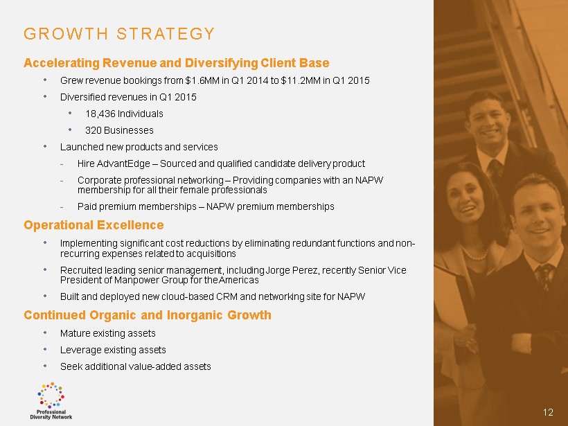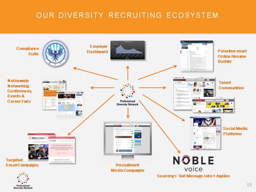 GROWTH STRATEGY Accelerating Revenue and Diversifying Client B ase • Grew revenue bookings from $1.6MM in Q1 2014 to $11.2MM in Q1 2015 • Diversified revenues in Q1 2015 • 18,436 Individuals • 320 Businesses • Launched new products and services - Hire AdvantEdge – Sourced and qualified candidate delivery product - Corporate professional networking – Providing companies with an NAPW membership for all their female professionals - Paid premium memberships – NAPW premium memberships Operational Excellence • Implementing significant cost reductions by eliminating redundant functions and non - recurring expenses related to acquisitions • Recruited leading senior management, including Jorge Perez, recently Senior Vice President of Manpower Group for the Americas • Built and deployed new cloud - based CRM and networking site for NAPW Continued Organic and Inorganic Growth • Mature existing assets • Leverage existing assets • Seek additional value - added assets 12