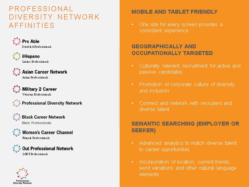 MOBILE AND TABLET FRIENDLY • One site for every screen provides a consistent experience GEOGRAPHICALLY AND OCCUPATIONALLY TARGETED • Culturally relevant recruitment for active and passive candidates • Promotion of corporate culture of diversity and inclusion • Connect and network with recruiters and diverse talent SEMANTIC SEARCHING (EMPLOYER OR SEEKER) • Advanced analytics to match diverse talent to career opportunities • Incorporation of location, current trends, word variations and other natural language elements PROFESSIONAL DIVERSITY NETWORK AFFINITIES LGBT Professionals Asian Professionals Veteran Professionals Latino Professionals Female Pr ofessionals Disabled Professionals Black Professionals
