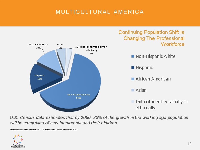 MULTICULTURAL AMERICA Non - Hispanic white 64% Hispanic 16% African American 12% Asian 5% Did not identify racially or ethnically 3% Non-Hispanic white Hispanic African American Asian Did not identify racially or ethnically Source: Bureau of Labor Statistics’ “The Employment Situation — June 2012” U.S. Census data estimates that by 2050, 83% of the growth in the working age population will be comprised of new immigrants and their children. Continuing Population Shift Is Changing The Professional Workforce 15