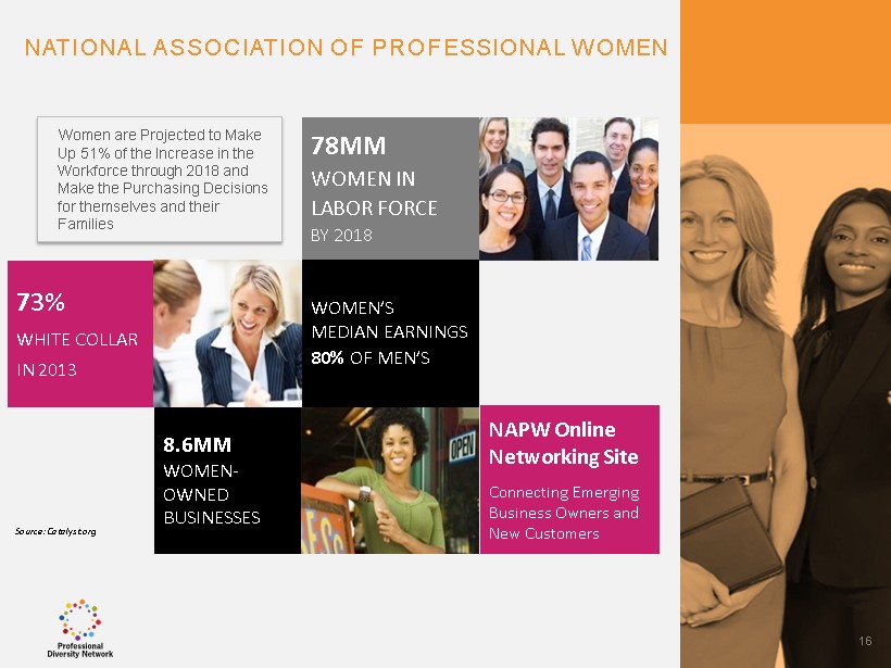 16 WOMEN’S MEDIAN EARNINGS 80% OF MEN’S 78MM WOMEN IN LABOR FORCE BY 2018 73% WHITE COLLAR IN 2013 8.6MM WOMEN - OWNED BUSINESSES NAPW Online Networking Site Connecting Emerging Business Owners and New Customers Women are Projected to Make Up 51% of the Increase in the Workforce through 2018 and Make the Purchasing Decisions for themselves and their Families Source: Catalyst.org NATIONAL ASSOCIATION OF PROFESSIONAL WOMEN