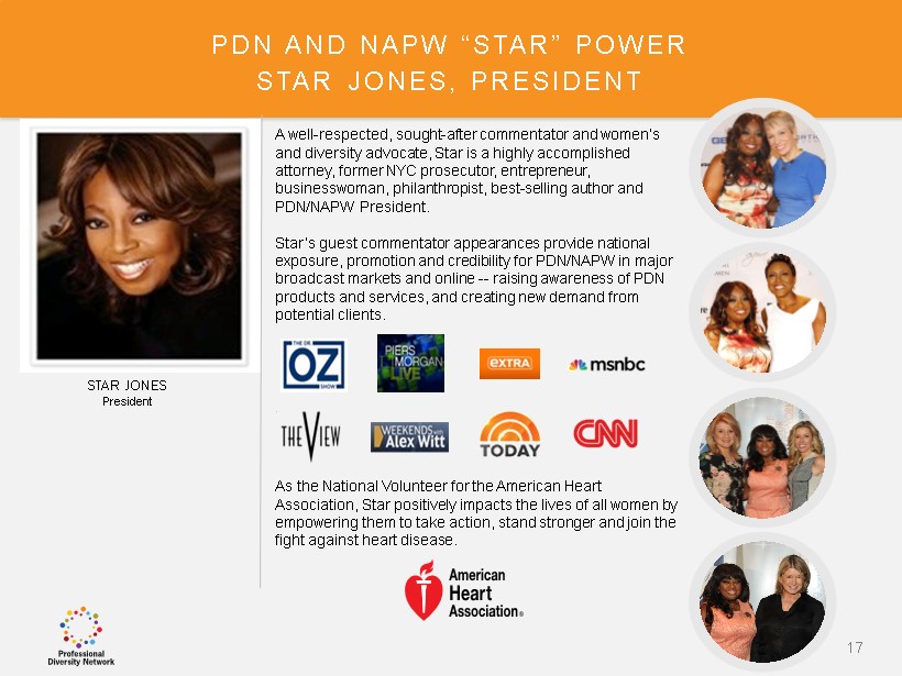 STAR JONES President A well - respected, sought - after commentator and women’s and diversity advocate, Star is a highly accomplished attorney, former NYC prosecutor, entrepreneur, businesswoman, philanthropist, best - selling author and PDN/NAPW President. Star’s guest commentator appearances provide national exposure, promotion and credibility for PDN/NAPW in major broadcast markets and online -- raising awareness of PDN products and services, and creating new demand from potential clients. As the National Volunteer for the American Heart Association, Star positively impacts the lives of all women by empowering them to take action, stand stronger and join the fight against heart disease. PDN AND NAPW “STAR” POWER STAR JONES, PRESIDENT 17