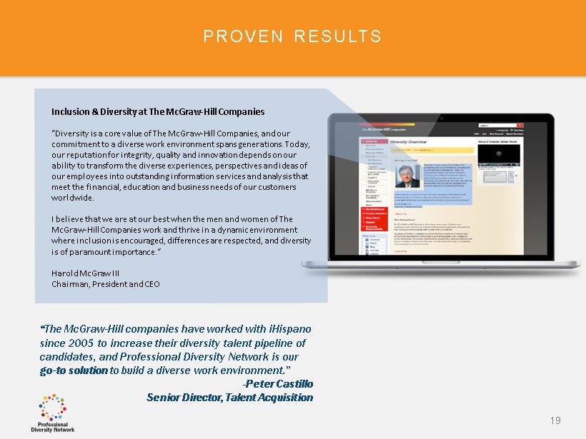 PROVEN RESULTS “ The McGraw - Hill companies have worked with iHispano since 2005 to increase their diversity talent pipeline of candidates, and Professional Diversity Network is our go - to solution to build a diverse work environment. ” - Peter Castillo Senior Director, Talent Acquisition Inclusion & Diversity at The McGraw - Hill Companies “ Diversity is a core value of The McGraw - Hill Companies, and our commitment to a diverse work environment spans generations. Today, our reputation for integrity, quality and innovation depends on our ability to transform the diverse experiences, perspectives and ideas of our employees into outstanding information services and analysis that meet the financial, education and business needs of our customers worldwide. I believe that we are at our best when the men and women of The McGraw - Hill Companies work and thrive in a dynamic environment where inclusion is encouraged, differences are respected, and diversity is of paramount importance. “ Harold McGraw III Chairman, President and CEO 19
