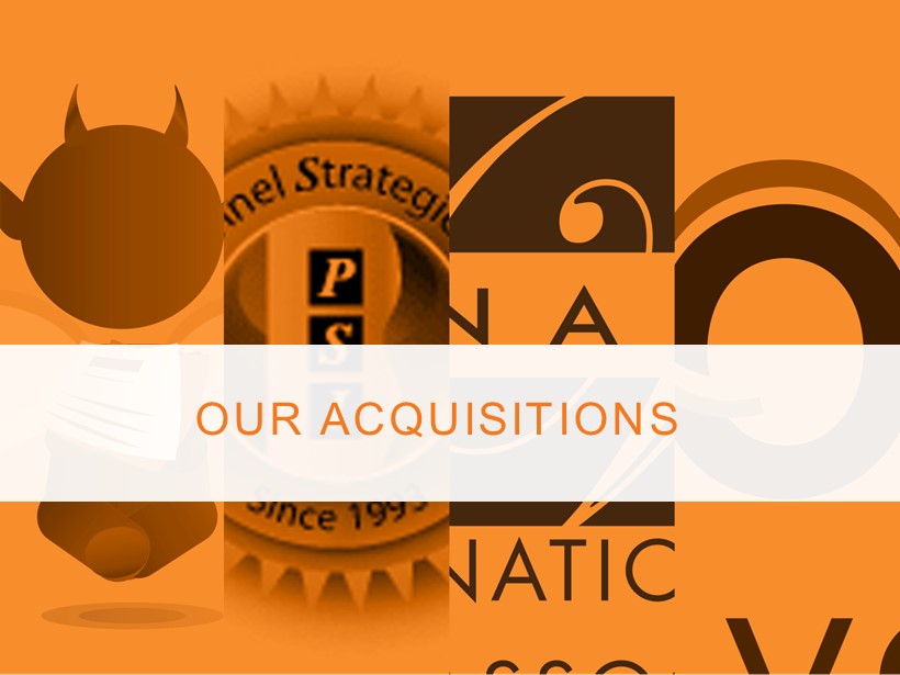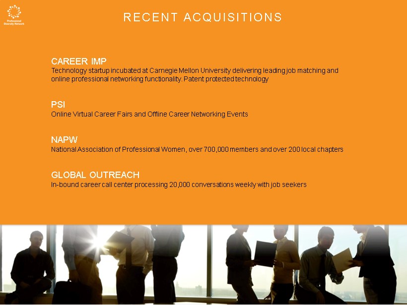 RECENT ACQUISITIONS CAREER IMP Technology startup incubated at Carnegie Mellon University delivering leading job matching and online professional networking functionality. Patent protected technology PSI Online Virtual Career Fairs and Offline Career Networking Events NAPW National Association of Professional Women, over 700,000 members and over 200 local chapters GLOBAL OUTREACH In - bound career call center processing 20,000 conversations weekly with job seekers