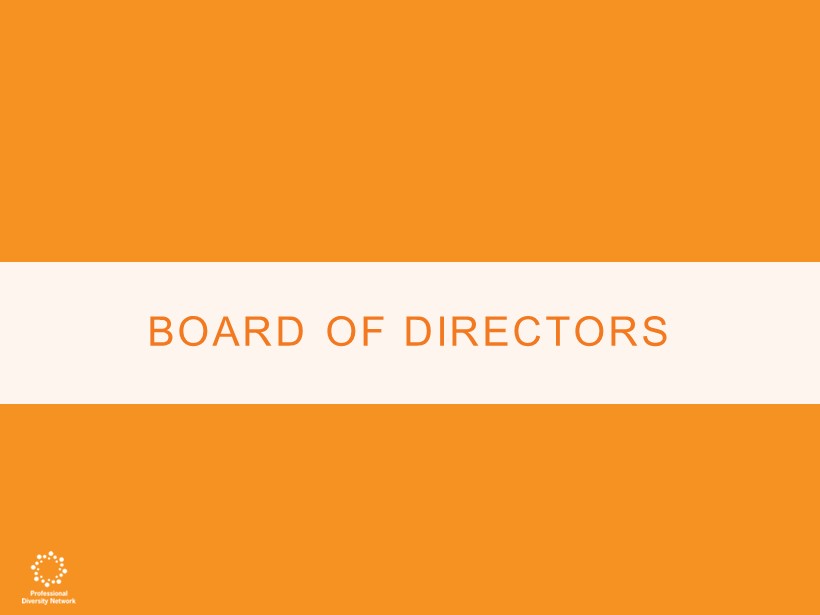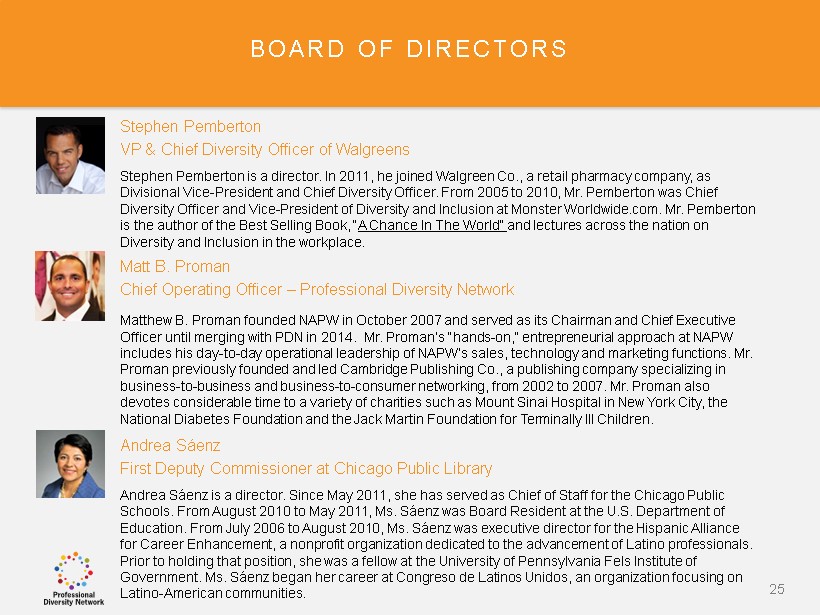 BOARD OF DIRECTORS 25 Stephen Pemberton VP & Chief Diversity Officer of Walgreens Stephen Pemberton is a director. In 2011, he joined Walgreen Co., a retail pharmacy company, as Divisional Vice - President and Chief Diversity Officer. From 2005 to 2010, Mr. Pemberton was Chief Diversity Officer and Vice - President of Diversity and Inclusion at Monster Worldwide.com . Mr. Pemberton is the author of the Best Selling Book, “ A Chance In The World” and lectures across the nation on Diversity and Inclusion in the workplace. Andrea Sáenz First Deputy Commissioner at Chicago Public Library Andrea Sáenz is a director. Since May 2011, she has served as Chief of Staff for the Chicago Public Schools. From August 2010 to May 2011, Ms. Sáenz was Board Resident at the U.S. Department of Education. From July 2006 to August 2010, Ms. Sáenz was executive director for the Hispanic Alliance for Career Enhancement, a nonprofit organization dedicated to the advancement of Latino professionals. Prior to holding that position, she was a fellow at the University of Pennsylvania Fels Institute of Government. Ms. Sáenz began her career at Congreso de Latinos Unidos , an organization focusing on Latino - American communities. Matt B. Proman Chief Operating Officer – Professional Diversity Network Matthew B. Proman founded NAPW in October 2007 and served as its Chairman and Chief Executive Officer until merging with PDN in 2014. Mr. Proman’s “hands - on,” entrepreneurial approach at NAPW includes his day - to - day operational leadership of NAPW’s sales, technology and marketing functions. Mr. Proman previously founded and led Cambridge Publishing Co., a publishing company specializing in business - to - business and business - to - consumer networking, from 2002 to 2007. Mr. Proman also devotes considerable time to a variety of charities such as Mount Sinai Hospital in New York City, the National Diabetes Foundation and the Jack Martin Foundation for Terminally Ill Children.