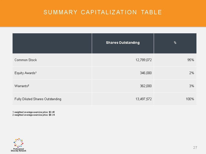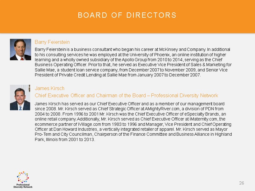 BOARD OF DIRECTORS 26 James Kirsch Chief Executive Officer and Chairman of the Board – Professional Diversity Network James Kirsch has served as our Chief Executive Officer and as a member of our management board since 2008. Mr. Kirsch served as Chief Strategic Officer at AMightyRiver.com , a division of PDN from 2004 to 2008. From 1996 to 2001 Mr. Kirsch was the Chief Executive Officer of eSpecialty Brands, an online retail company. Additionally, Mr . Kirsch served as Chief Executive Officer at iMaternity.com , the ecommerce partner of iVillage.com from 1983 to 1996 and Manager, Vice President and Chief Operating Officer at Dan Howard Industries, a vertically integrated retailer of apparel. Mr. Kirsch served as Mayor Pro - Tem and City Councilman, Chairperson of the Finance Committee and Business Alliance in Highland Park, Illinois from 2001 to 2013. Barry Feierstein Barry Feierstein is a business consultant who began his career at McKinsey and Company. In additional to his consulting services he was employed at the University of Phoenix, an online institution of higher learning and a wholly owned subsidiary of the Apollo Group from 2010 to 2014, serving as the Chief Business Operating Officer. Prior to that, he served as Executive Vice President of Sales & Marketing for Sallie Mae, a student loan service company, from December 2007 to November 2009, and Senior Vice President of Private Credit Lending at Sallie Mae from January 2007 to December 2007.