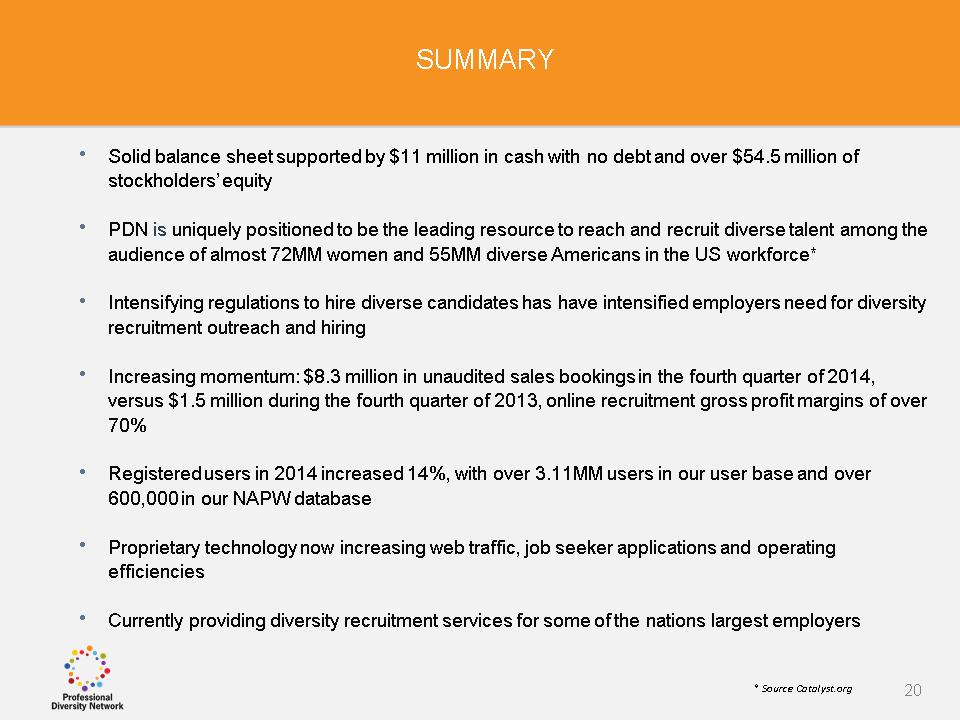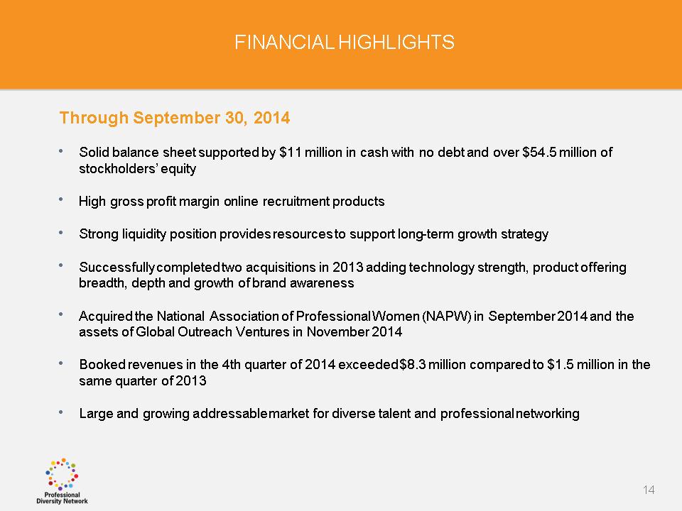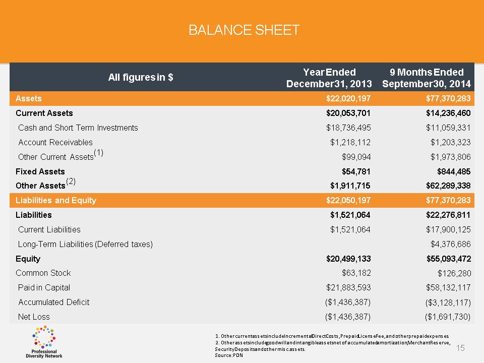 BALANCE SHEET * All figures in $ Year Ended December 31, 2013 9 Months Ended September 30, 2014 Assets $22,020,197 $77,370,283 Current Assets $20,053,701 $14,236,460 Cash and Short Term Investments $18,736,495 $11,059,331 Account Receivables $1,218,112 $1,203,323 Other Current Assets(1) $99,094 $1,973,806 Fixed Assets $54,781 $844,485 Other Assets(2) $1,911,715 $62,289,338 Liabilities and Equity $22,050,197 $77,370,283 Liabilities $1,521,064 $22,276,811 Current Liabilities $1,521,064 $17,900,125 Long-Term Liabilities (Deferred taxes) $4,376,686 Equity $20,499,133 $55,093,472 Common Stock $63,182 $126,280 Paid in Capital $21,883,593 $58,132,117 Accumulated Deficit ($1,436,387) ($3,128,117) Net Loss ($1,436,387) ($1,691,730) 1. Other current assets include Incremental Direct Costs, Prepaid License Fee, and other prepaid expenses . 2. Other assets include goodwill and intangible assets net of accumulated amortization, Merchant Reserve, Security Deposits and other misc. assets . Source: PDN