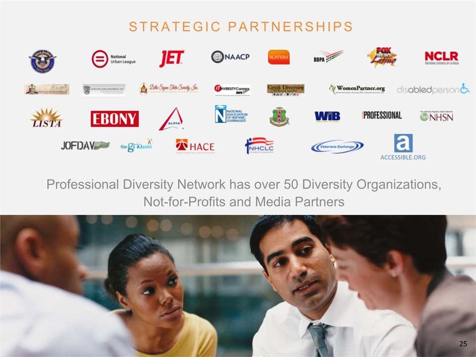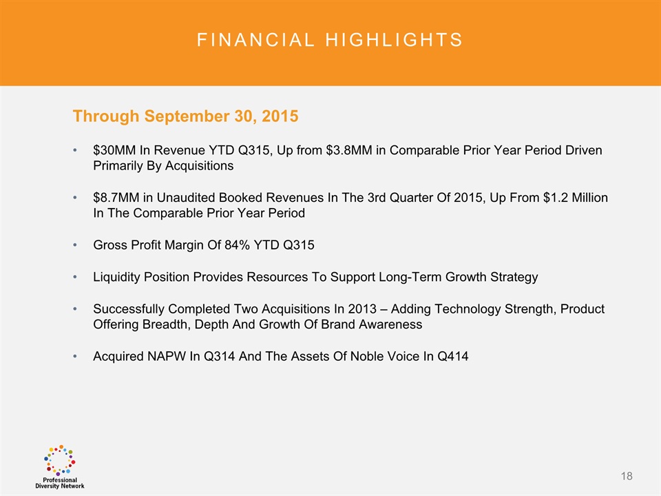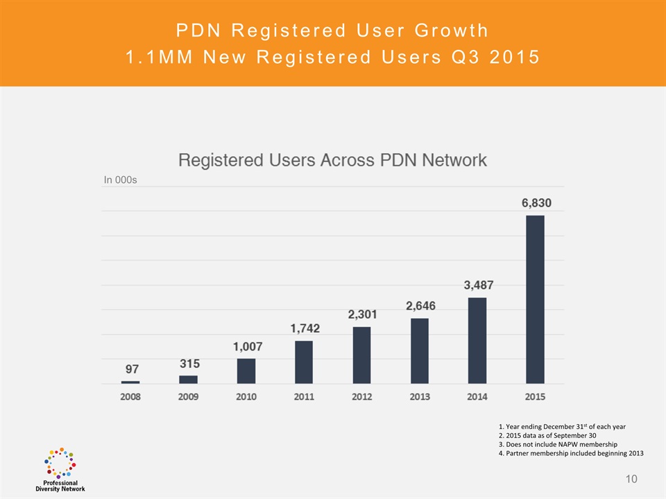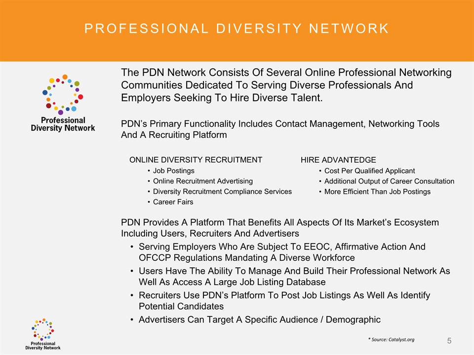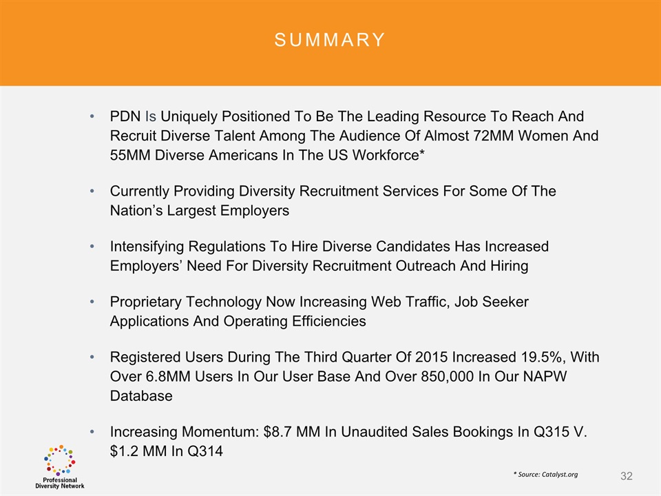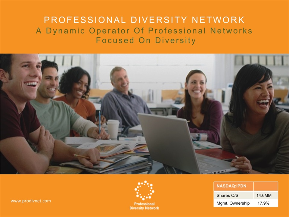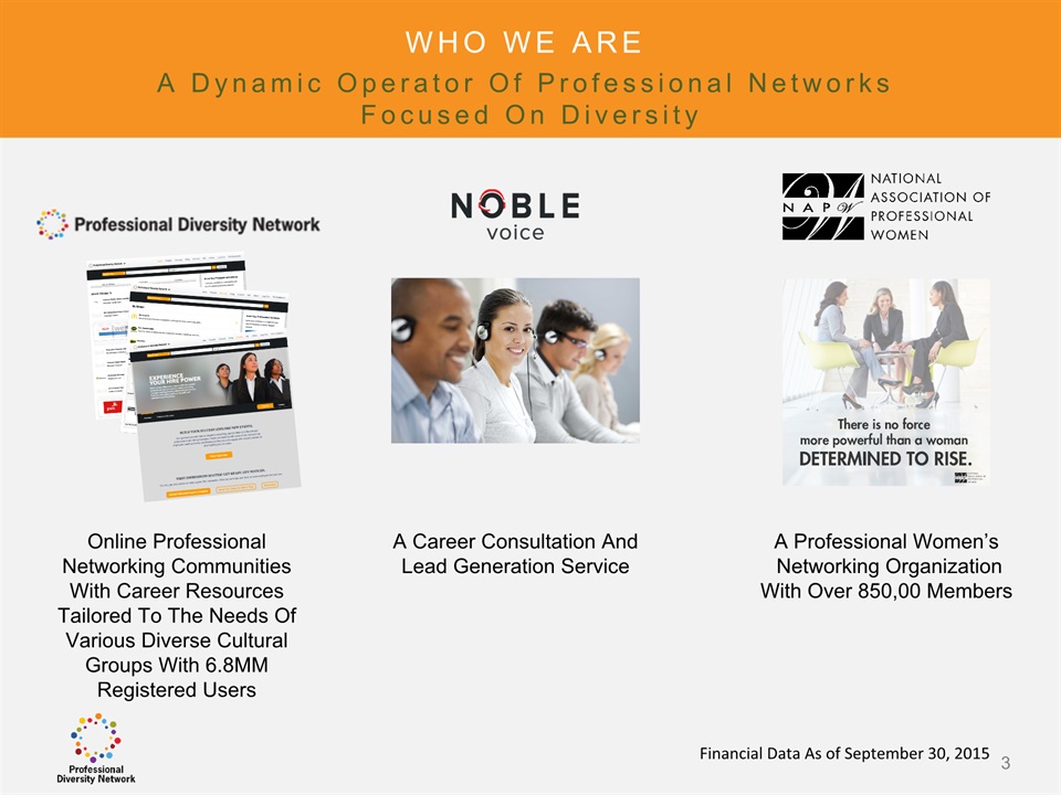 SAFE HARBOR Notice Regarding Forward-Looking StatementsThis presentation contains forward-looking statements within the meaning of the Private Securities Litigation Reform Act of 1995. All statements regarding Professional Diversity Network’s (“PDN” or the “Company”) expected future financial position, results of operations, cash flows, business strategy, budgets, projected costs, capital expenditures, products, competitive positions, growth opportunities, plans and objectives of management for future operations, as well as statements that include the words such as “expects,” “reaffirms,” “intends,” “anticipates,” “plans,” “believes,” “seeks,” “estimates,” “optimistic,” or variations of such words and similar expressions, are forward-looking statements. These forward-looking statements are subject to a number of risks, uncertainties and assumptions, including those described under the heading “Risk Factors” in the Company’s Annual Report on Form 10K and filings with the Securities and Exchange Commission (the “SEC”). Moreover, the Company operates in a very competitive and rapidly changing environment. New risks emerge from time to time. It is not possible for Company management to predict all risks, nor can the Company assess the impact of all factors on its business or the extent to which any factor, or combination of factors, may cause actual results to differ materially from those contained in any forward-looking statements the Company may make. In light of these risks, uncertainties and assumptions, the forward-looking events and circumstances discussed in this presentation may not occur and actual results could differ materially and adversely from those anticipated or implied in the forward-looking statements. These risk factors are listed from time to time in PDN’s SEC filings, including but not limited to its Annual Report on Form 10-K filed on March 31, 2015. Forward looking statements speak only as of the date they were made, and PDN does not assume any obligation to publicly update or revise any forward-looking statements for any reason. 2