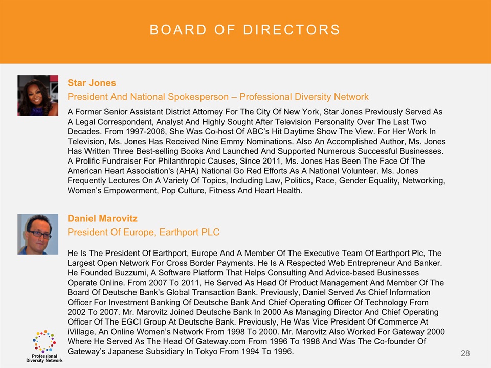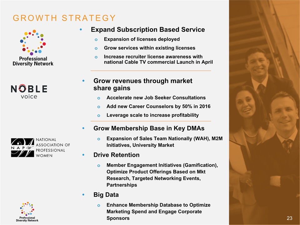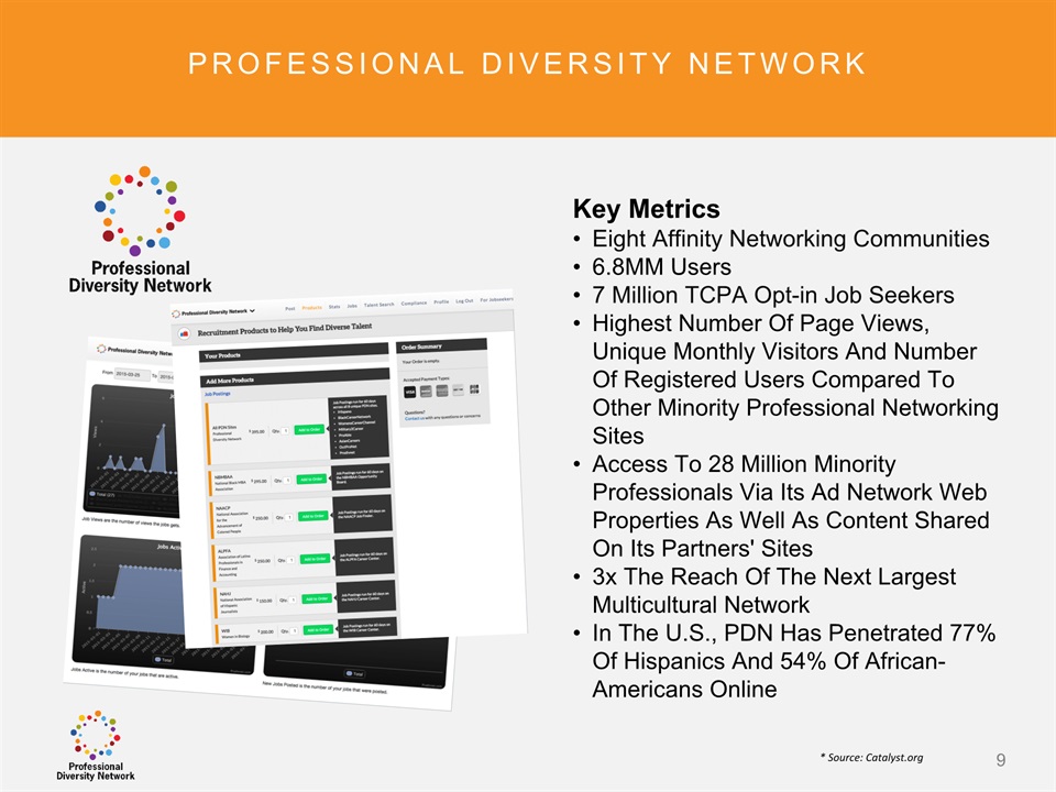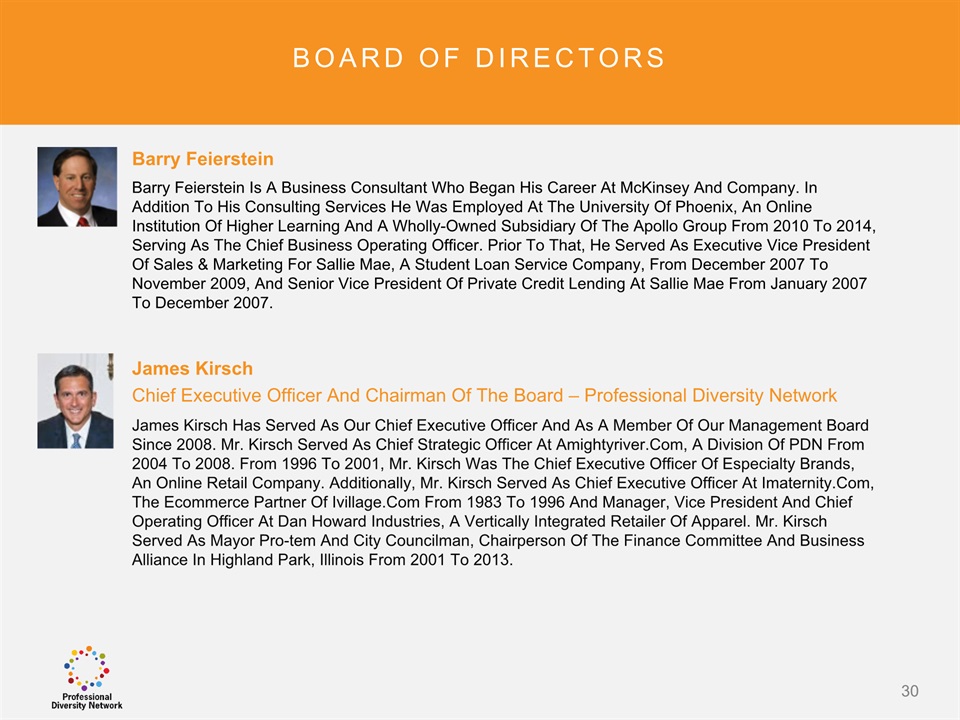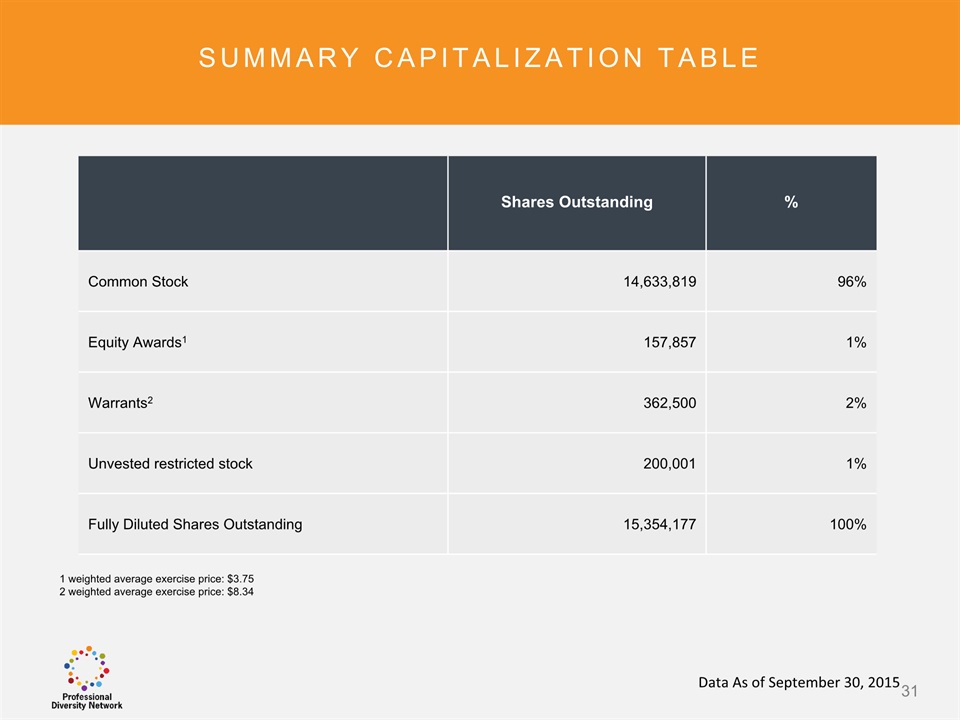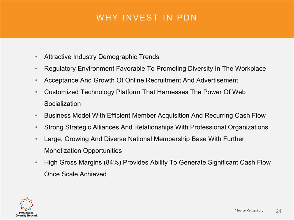 SAFE HARBOR Notice Regarding Forward-Looking StatementsThis presentation contains forward-looking statements within the meaning of the Private Securities Litigation Reform Act of 1995. All statements regarding Professional Diversity Network’s (“PDN” or the “Company”) expected future financial position, results of operations, cash flows, business strategy, budgets, projected costs, capital expenditures, products, competitive positions, growth opportunities, plans and objectives of management for future operations, as well as statements that include the words such as “expects,” “reaffirms,” “intends,” “anticipates,” “plans,” “believes,” “seeks,” “estimates,” “optimistic,” or variations of such words and similar expressions, are forward-looking statements. These forward-looking statements are subject to a number of risks, uncertainties and assumptions, including those described under the heading “Risk Factors” in the Company’s Annual Report on Form 10K and filings with the Securities and Exchange Commission (the “SEC”). Moreover, the Company operates in a very competitive and rapidly changing environment. New risks emerge from time to time. It is not possible for Company management to predict all risks, nor can the Company assess the impact of all factors on its business or the extent to which any factor, or combination of factors, may cause actual results to differ materially from those contained in any forward-looking statements the Company may make. In light of these risks, uncertainties and assumptions, the forward-looking events and circumstances discussed in this presentation may not occur and actual results could differ materially and adversely from those anticipated or implied in the forward-looking statements. These risk factors are listed from time to time in PDN’s SEC filings, including but not limited to its Annual Report on Form 10-K filed on March 31, 2015. Forward looking statements speak only as of the date they were made, and PDN does not assume any obligation to publicly update or revise any forward-looking statements for any reason. 2