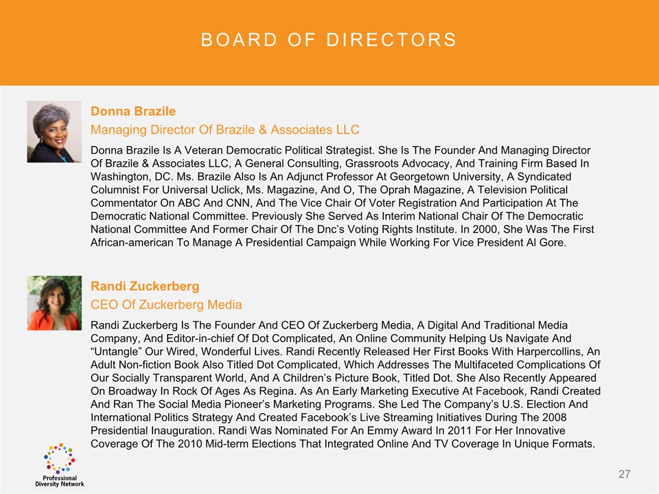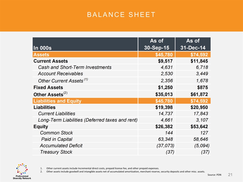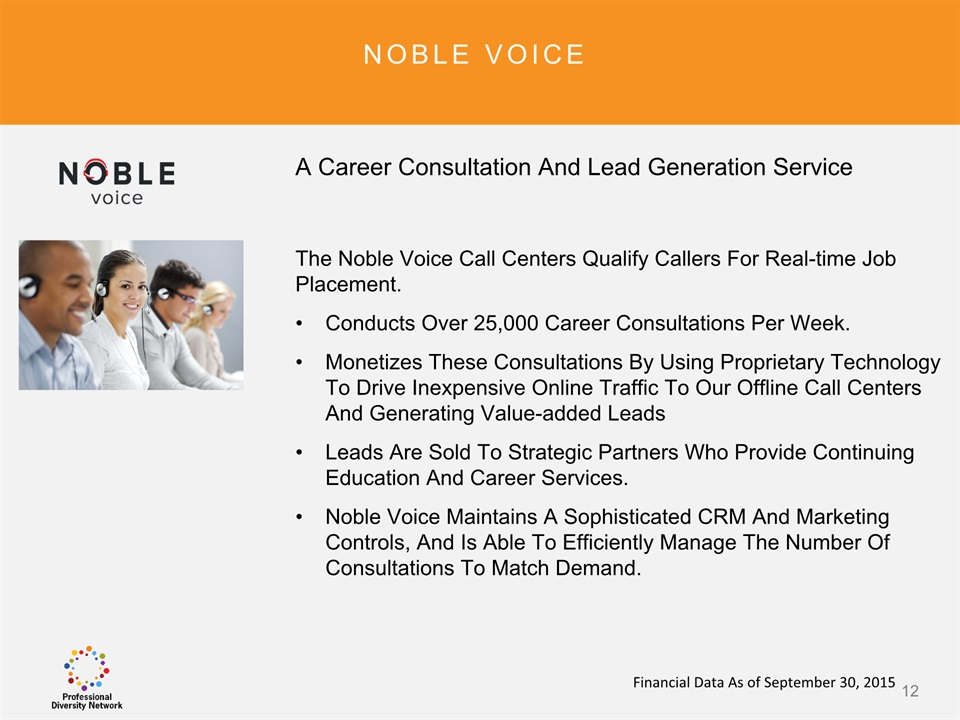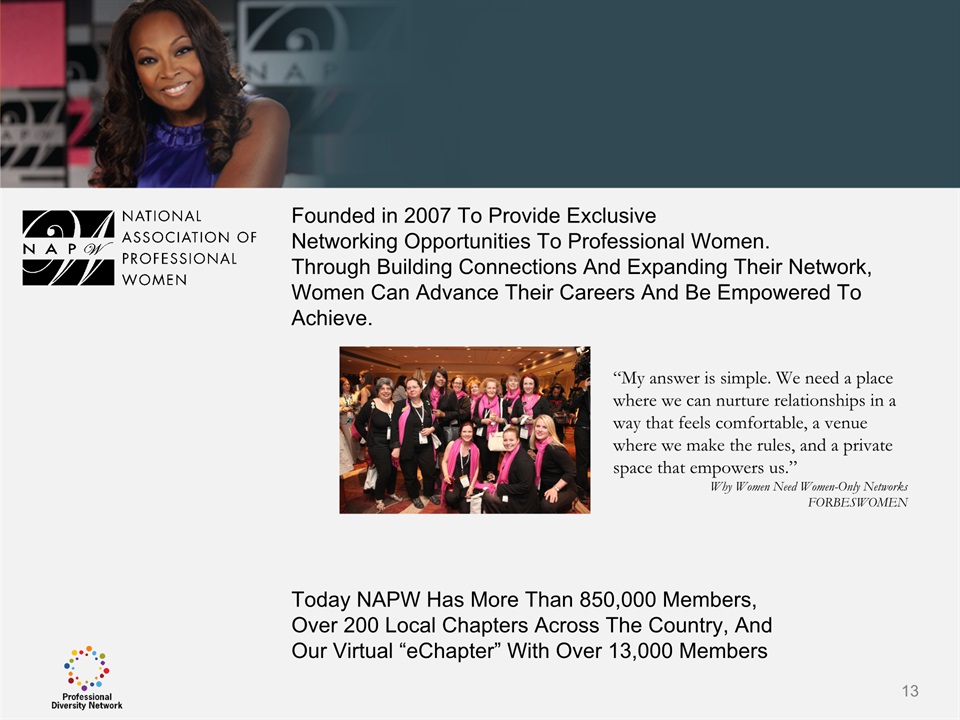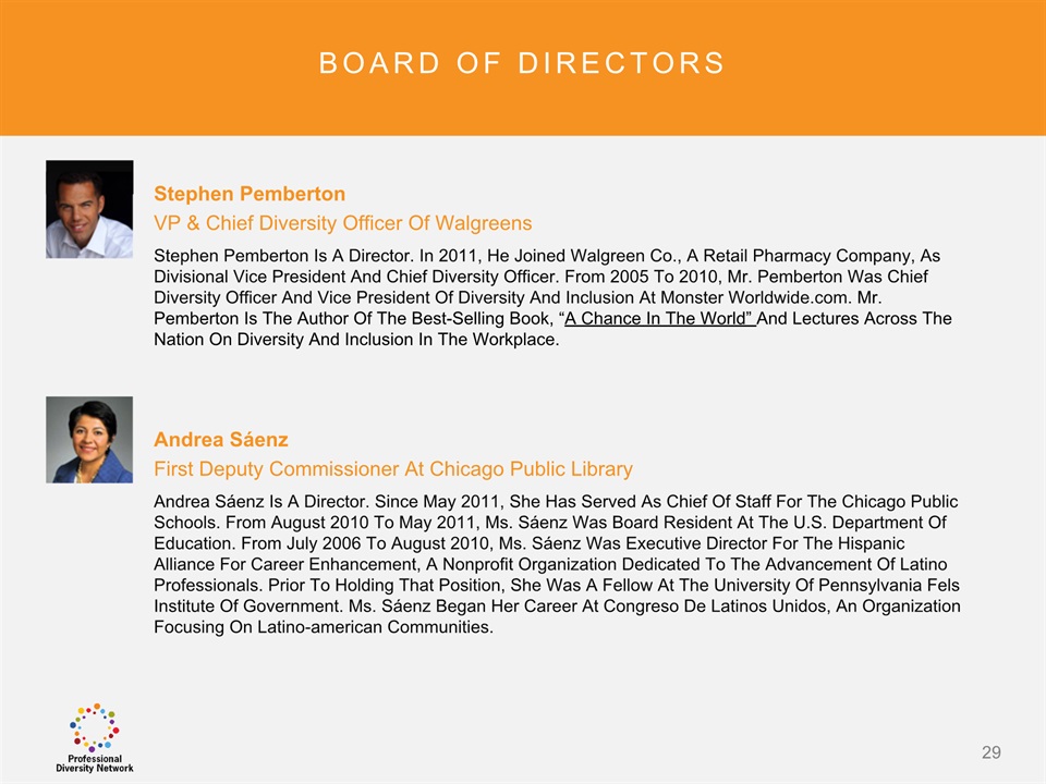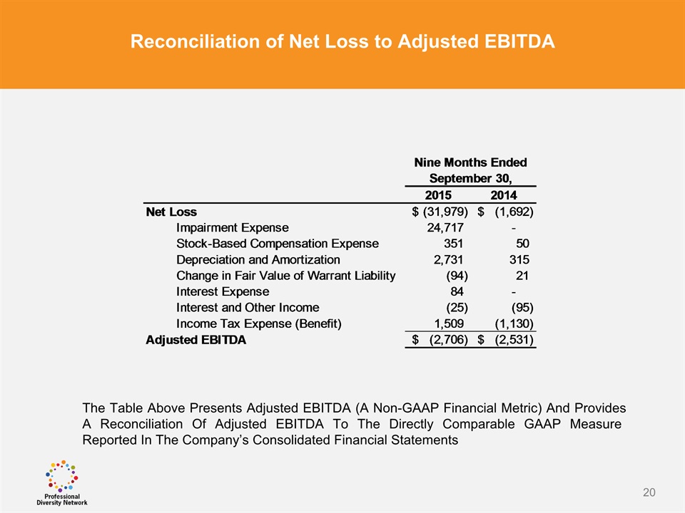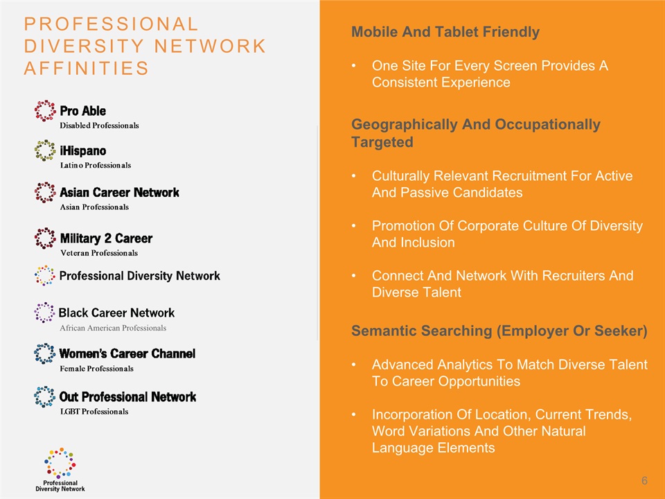 SAFE HARBOR Notice Regarding Forward-Looking StatementsThis presentation contains forward-looking statements within the meaning of the Private Securities Litigation Reform Act of 1995. All statements regarding Professional Diversity Network’s (“PDN” or the “Company”) expected future financial position, results of operations, cash flows, business strategy, budgets, projected costs, capital expenditures, products, competitive positions, growth opportunities, plans and objectives of management for future operations, as well as statements that include the words such as “expects,” “reaffirms,” “intends,” “anticipates,” “plans,” “believes,” “seeks,” “estimates,” “optimistic,” or variations of such words and similar expressions, are forward-looking statements. These forward-looking statements are subject to a number of risks, uncertainties and assumptions, including those described under the heading “Risk Factors” in the Company’s Annual Report on Form 10K and filings with the Securities and Exchange Commission (the “SEC”). Moreover, the Company operates in a very competitive and rapidly changing environment. New risks emerge from time to time. It is not possible for Company management to predict all risks, nor can the Company assess the impact of all factors on its business or the extent to which any factor, or combination of factors, may cause actual results to differ materially from those contained in any forward-looking statements the Company may make. In light of these risks, uncertainties and assumptions, the forward-looking events and circumstances discussed in this presentation may not occur and actual results could differ materially and adversely from those anticipated or implied in the forward-looking statements. These risk factors are listed from time to time in PDN’s SEC filings, including but not limited to its Annual Report on Form 10-K filed on March 31, 2015. Forward looking statements speak only as of the date they were made, and PDN does not assume any obligation to publicly update or revise any forward-looking statements for any reason. 2