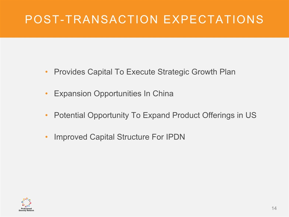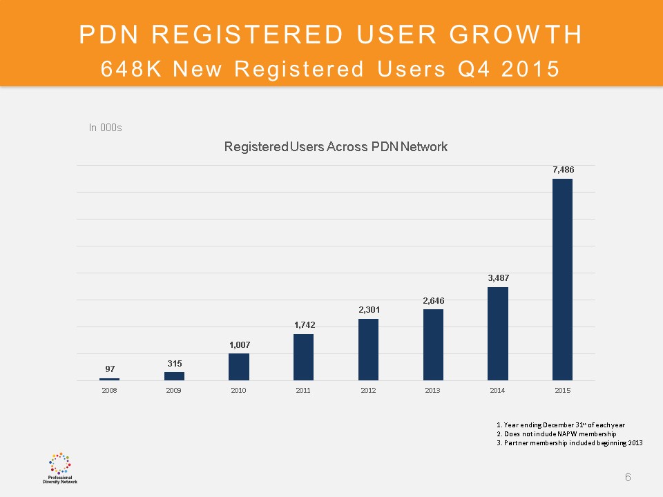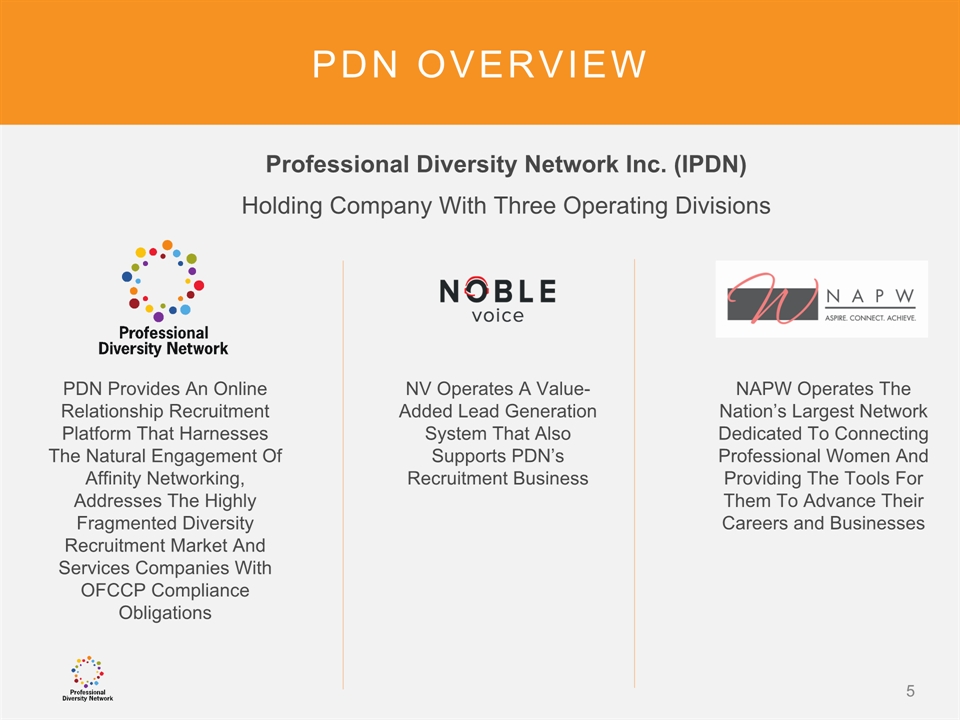 SAFE HARBOR Notice Regarding Forward Looking StatementsThis presentation contains forward-looking statements within the meaning of the Private Securities Litigation Reform Act of 1995. All statements regarding Professional Diversity Network’s (“PDN” or the “Company”) expected future financial position, results of operations, cash flows, business strategy, budgets, projected costs, capital expenditures, products, competitive positions, growth opportunities, plans and objectives of management for future operations, as well as statements that include the words such as “expects,” “reaffirms” “intends,” “anticipates,” “plans,” “believes,” “seeks,” “estimates,” “optimistic,” or variations of such words and similar expressions, are forward-looking statements. These forward-looking statements are subject to a number of risks, uncertainties and assumptions, including those described under the heading “Risk Factors” in the Company’s preliminary prospectus and filings with the Securities and Exchange Commission (the “SEC”). Moreover, the Company operates in a very competitive and rapidly changing environment. New risks emerge from time to time. It is not possible for Company management to predict all risks, nor can the Company assess the impact of all factors on its business or the extent to which any factor, or combination of factors, may cause actual results to differ materially from those contained in any forward-looking statements the Company may make. In light of these risks, uncertainties and assumptions, the forward-looking events and circumstances discussed in this presentation may not occur and actual results could differ materially and adversely from those anticipated or implied in the forward-looking statements. These risk factors are listed from time to time in PDN’s SEC filings, including but not limited to its Annual Report on Form 10-K filed on March 30, 2016. PDN does not assume any obligation to publicly update or revise any forward-looking statements for any reason. 2