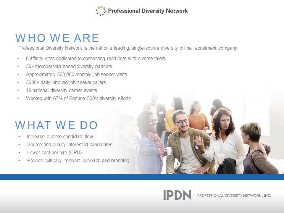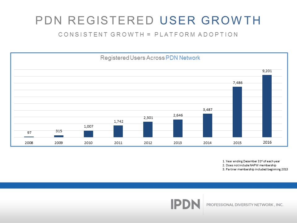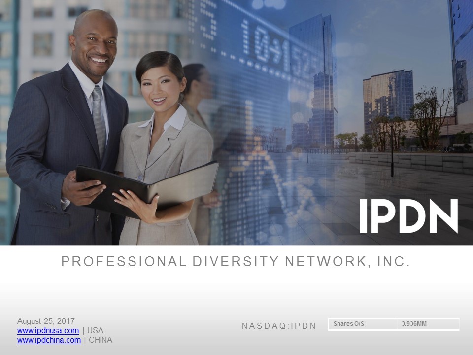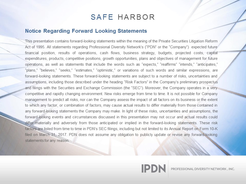 SAFE HARBOR Notice Regarding Forward Looking StatementsThis presentation contains forward-looking statements within the meaning of the Private Securities Litigation Reform Act of 1995. All statements regarding Professional Diversity Network’s (“PDN” or the “Company”) expected future financial position, results of operations, cash flows, business strategy, budgets, projected costs, capital expenditures, products, competitive positions, growth opportunities, plans and objectives of management for future operations, as well as statements that include the words such as “expects,” “reaffirms” “intends,” “anticipates,” “plans,” “believes,” “seeks,” “estimates,” “optimistic,” or variations of such words and similar expressions, are forward-looking statements. These forward-looking statements are subject to a number of risks, uncertainties and assumptions, including those described under the heading “Risk Factors” in the Company’s preliminary prospectus and filings with the Securities and Exchange Commission (the “SEC”). Moreover, the Company operates in a very competitive and rapidly changing environment. New risks emerge from time to time. It is not possible for Company management to predict all risks, nor can the Company assess the impact of all factors on its business or the extent to which any factor, or combination of factors, may cause actual results to differ materially from those contained in any forward-looking statements the Company may make. In light of these risks, uncertainties and assumptions, the forward-looking events and circumstances discussed in this presentation may not occur and actual results could differ materially and adversely from those anticipated or implied in the forward-looking statements. These risk factors are listed from time to time in PDN’s SEC filings, including but not limited to its Annual Report on Form 10-K filed on March 31, 2017. PDN does not assume any obligation to publicly update or revise any forward-looking statements for any reason.