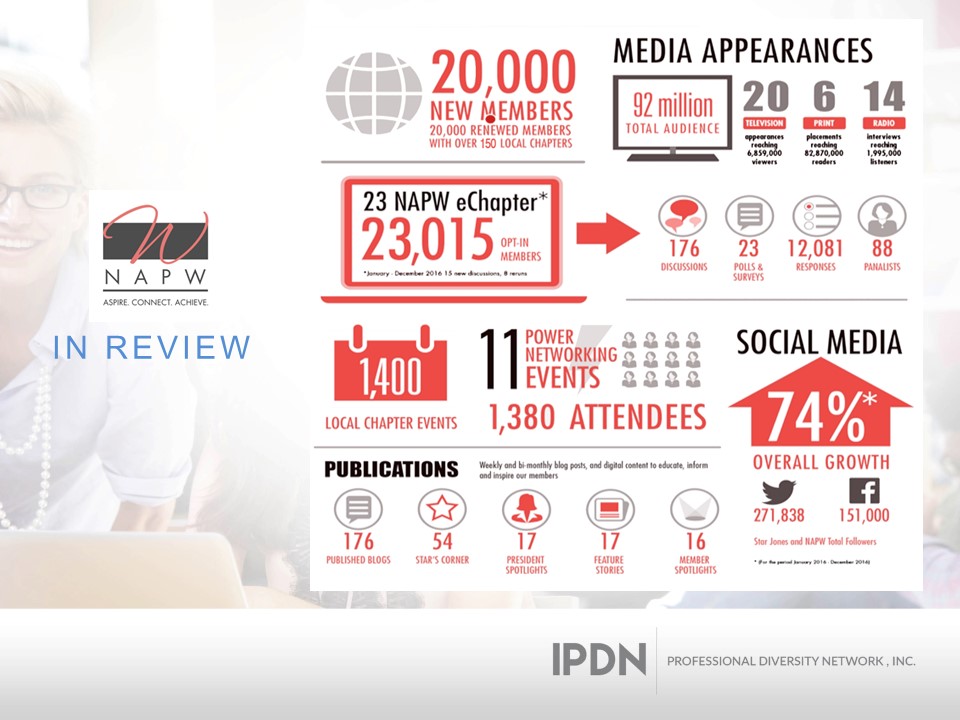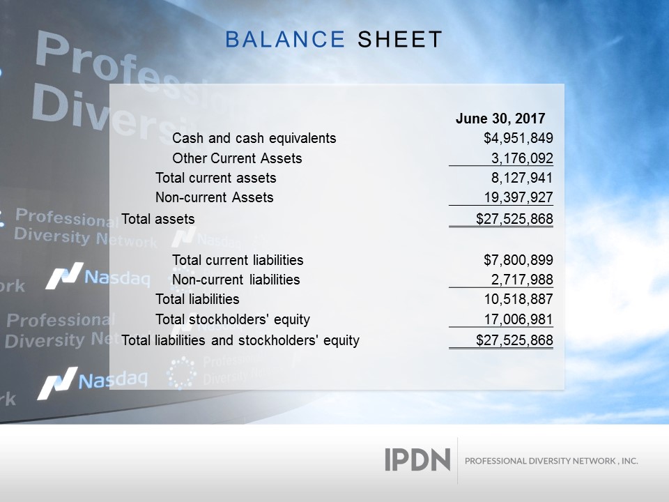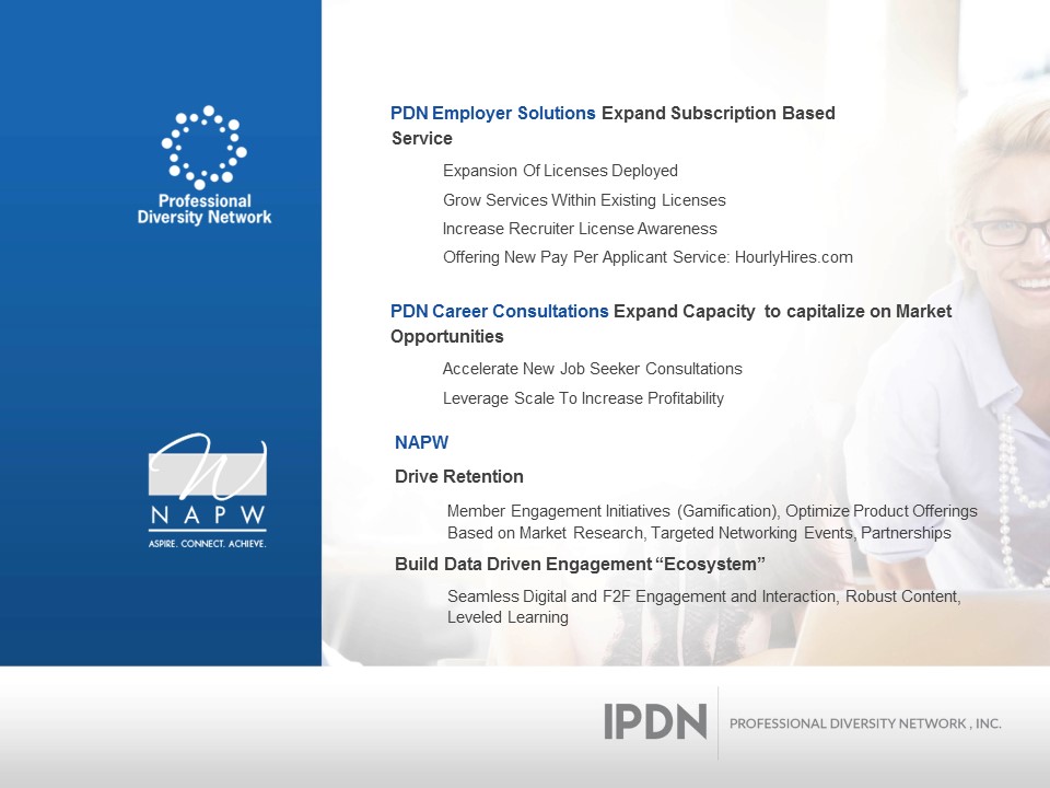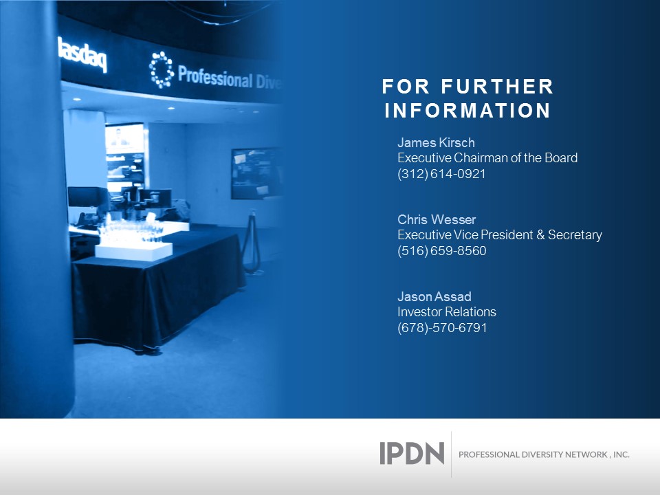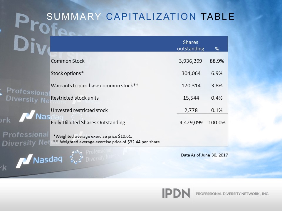 SAFE HARBOR Notice Regarding Forward Looking StatementsThis presentation contains forward-looking statements within the meaning of the Private Securities Litigation Reform Act of 1995. All statements regarding Professional Diversity Network’s (“PDN” or the “Company”) expected future financial position, results of operations, cash flows, business strategy, budgets, projected costs, capital expenditures, products, competitive positions, growth opportunities, plans and objectives of management for future operations, as well as statements that include the words such as “expects,” “reaffirms” “intends,” “anticipates,” “plans,” “believes,” “seeks,” “estimates,” “optimistic,” or variations of such words and similar expressions, are forward-looking statements. These forward-looking statements are subject to a number of risks, uncertainties and assumptions, including those described under the heading “Risk Factors” in the Company’s preliminary prospectus and filings with the Securities and Exchange Commission (the “SEC”). Moreover, the Company operates in a very competitive and rapidly changing environment. New risks emerge from time to time. It is not possible for Company management to predict all risks, nor can the Company assess the impact of all factors on its business or the extent to which any factor, or combination of factors, may cause actual results to differ materially from those contained in any forward-looking statements the Company may make. In light of these risks, uncertainties and assumptions, the forward-looking events and circumstances discussed in this presentation may not occur and actual results could differ materially and adversely from those anticipated or implied in the forward-looking statements. These risk factors are listed from time to time in PDN’s SEC filings, including but not limited to its Annual Report on Form 10-K filed on March 31, 2017. PDN does not assume any obligation to publicly update or revise any forward-looking statements for any reason.