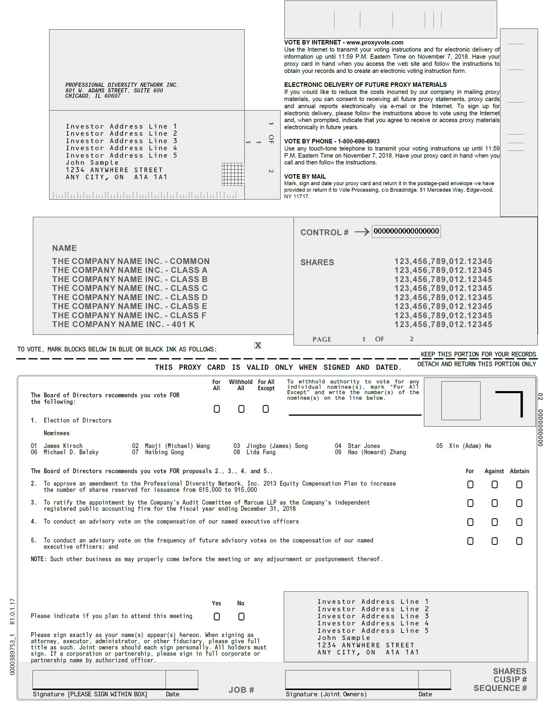 The Board of Professional Diversity Network recommends that Professional Diversity Network stockholders vote FOR the election of each nominee for director (Proposal 1), FOR the amendment to the Professional Diversity Network, Inc. 2013 Equity Compensation Plan (Proposal 2), FOR the ratification of the Company’s selection of Marcum LLP as the Company’s independent registered public accounting firm (Proposal 3), FOR the approval of the compensation paid to our named executive officers as disclosed in this Proxy Statement (Proposal 4) and FOR the approval of the frequency of future advisory votes to approve the compensation of our named executive officers (Proposal 5).