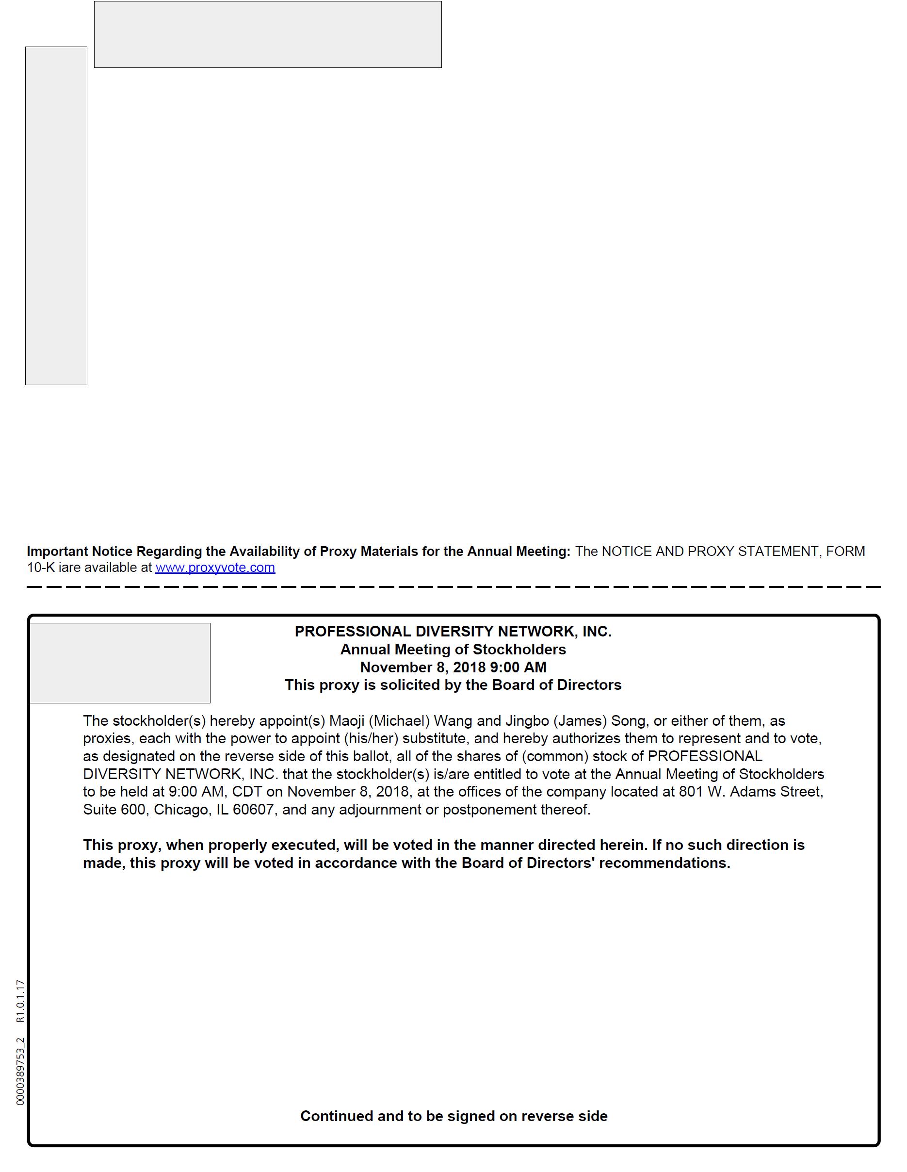 On behalf of the Board of Directors, I am pleased to invite you to attend the 2018 Annual Meeting of Stockholders of Professional Diversity Network, Inc. (the “Company”). The meeting will be held at the Company’s offices at 801 W. Adams Street, Sixth Floor, Chicago, Illinois 60607, on November 8, 2018, at 9:00 a.m., Central Time.