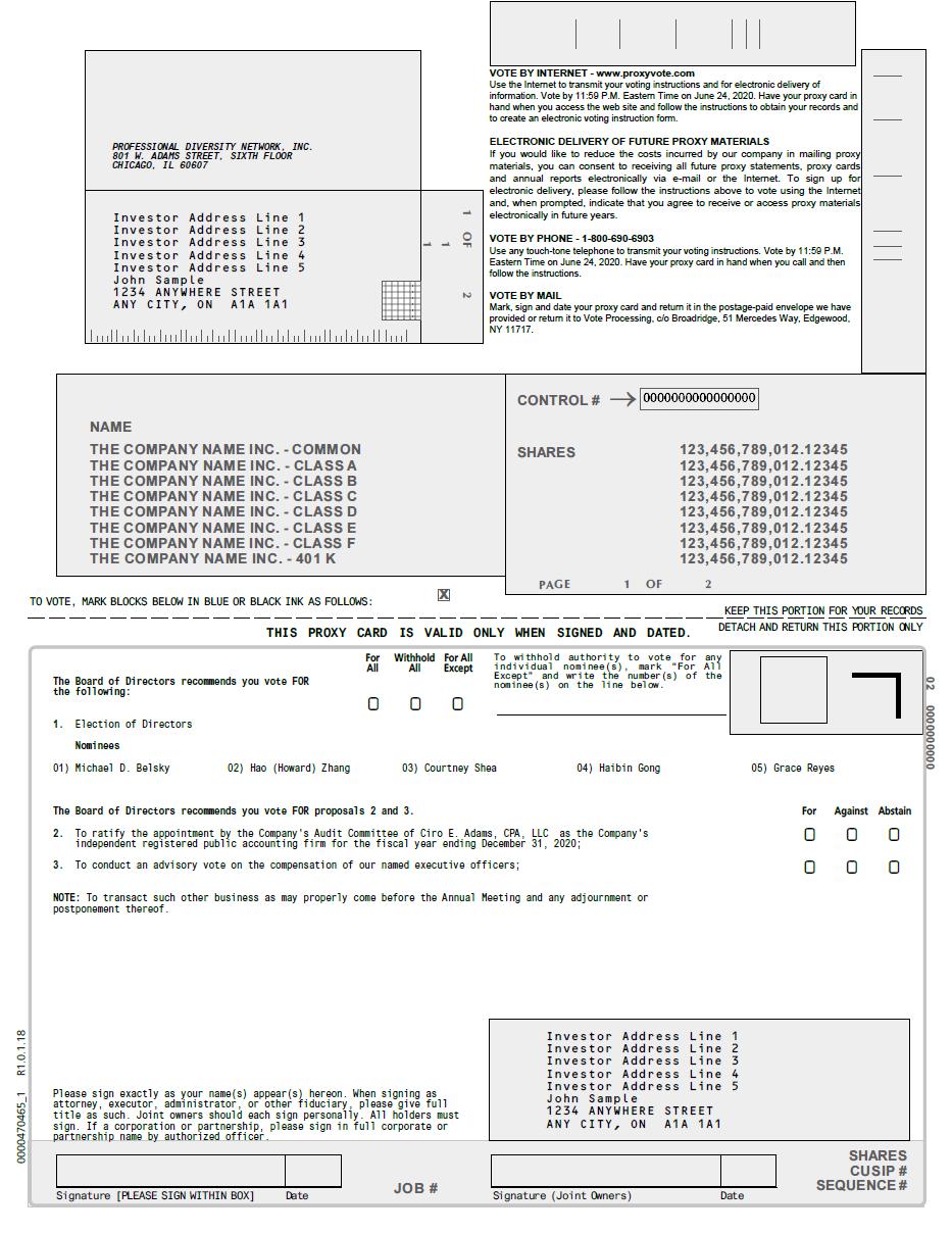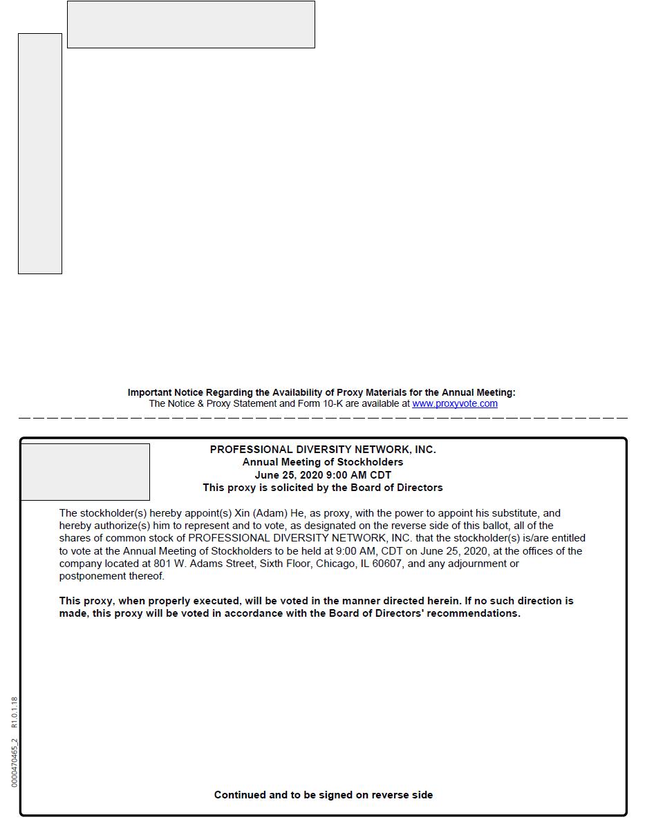 This Supplement Proxy Statement, dated June 1, 2020 (this “Supplement”) supplements and amends the definitive proxy statement (the “Proxy Statement”) of Professional Diversity Network, Inc. (the “Company”) filed with the Securities and Exchange Commission on May 12, 2020, relating to the Company’s 2020 annual meeting of stockholders (the “Annual Meeting”) to be held on June 25, 2020 at 9:00 a.m., Central Time, at 801 W. Adams Street, Sixth Floor, Chicago, IL, 60607. This Supplement, which describes changes to the slate of director nominees standing for election at the Annual Meeting, supplements and amends the Proxy Statement and should be read in conjunction therewith. Except as described in this Supplement, the information previously provided in the Proxy Statement continues to apply and should be considered carefully in voting your shares.